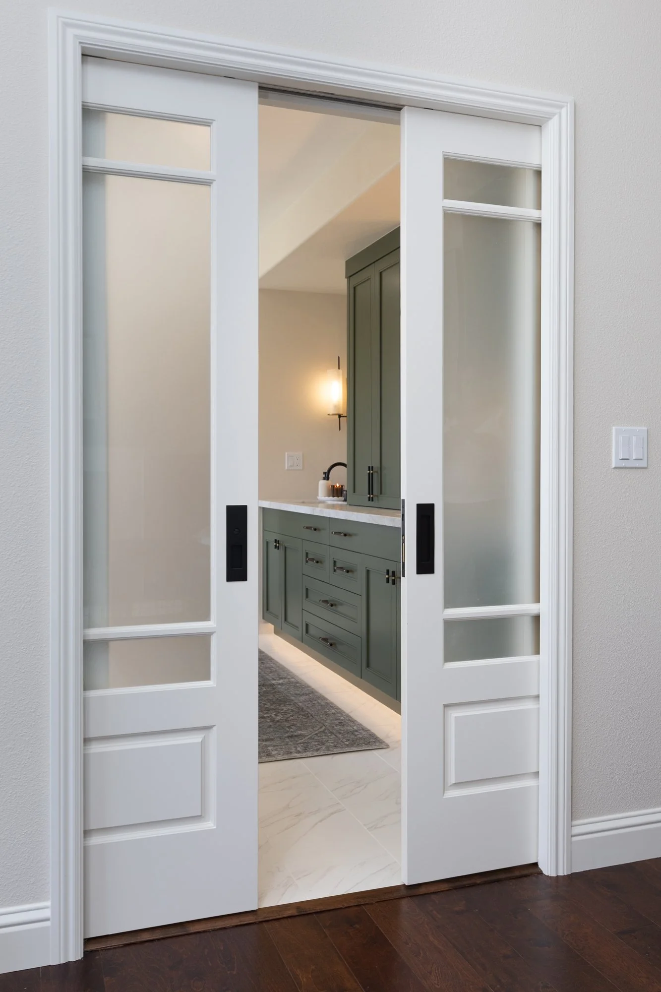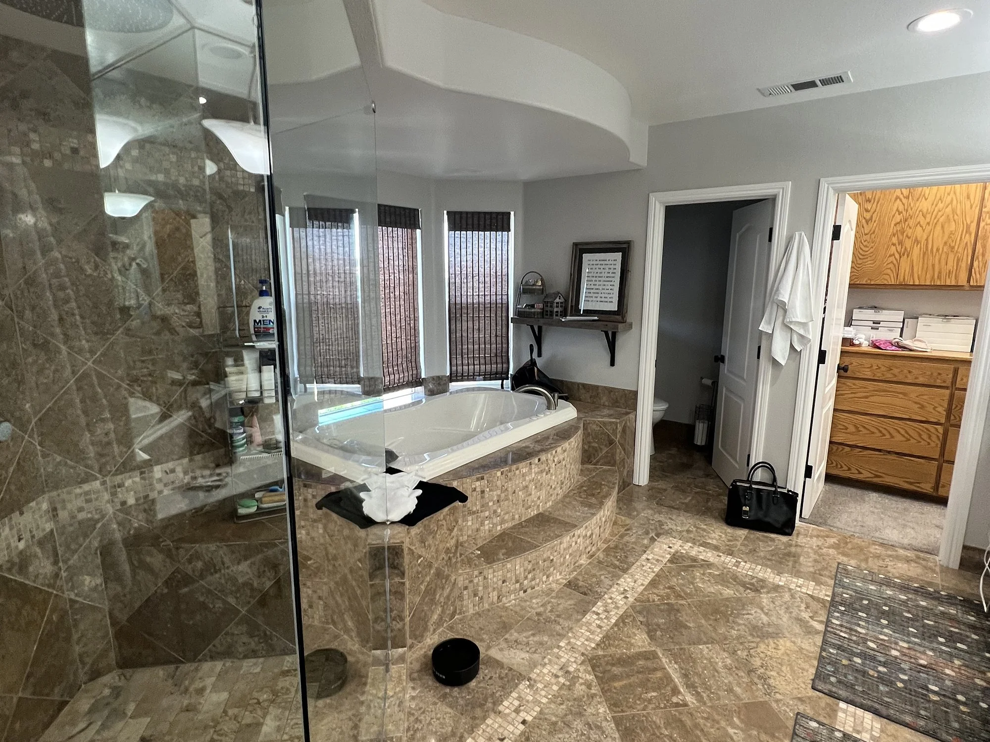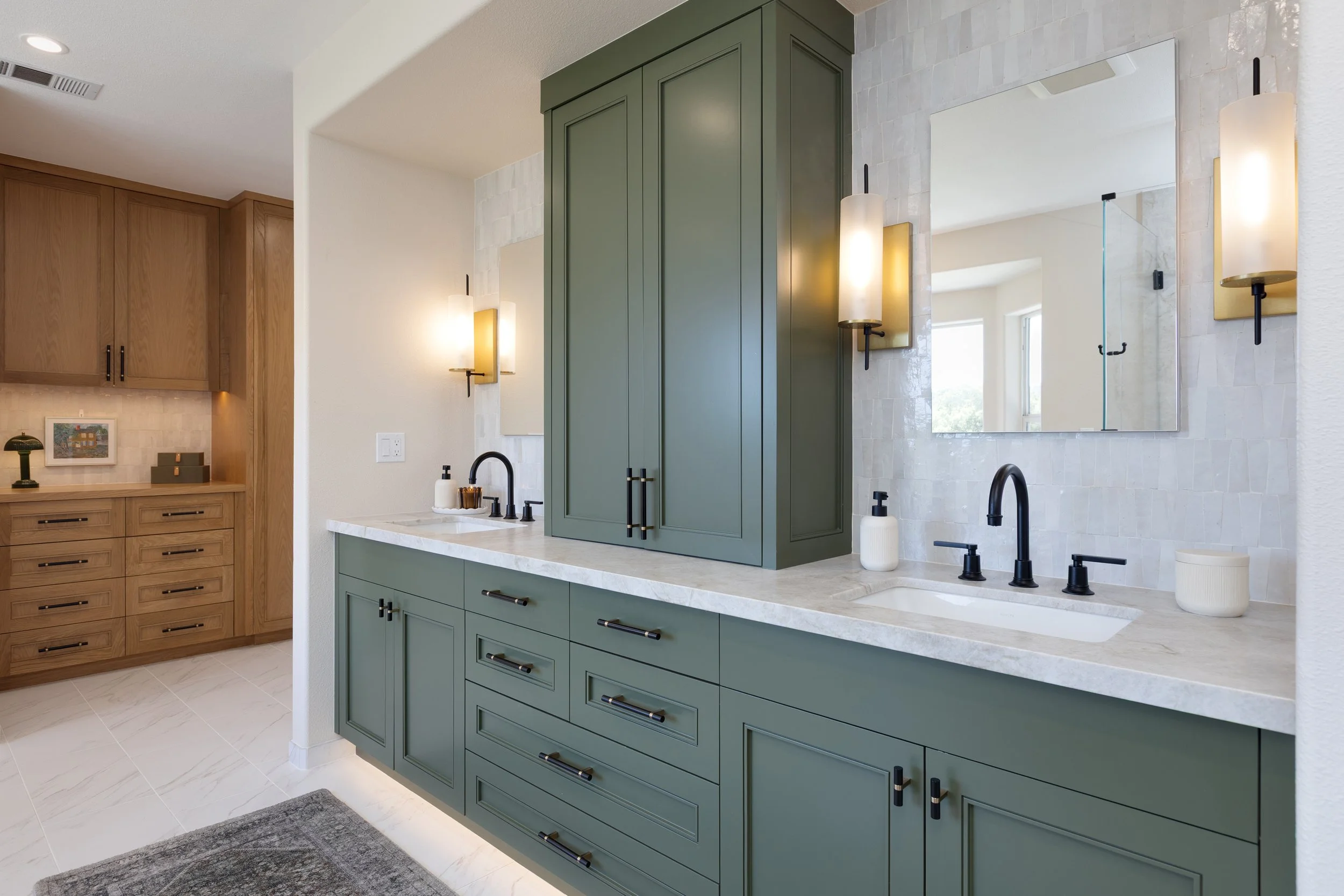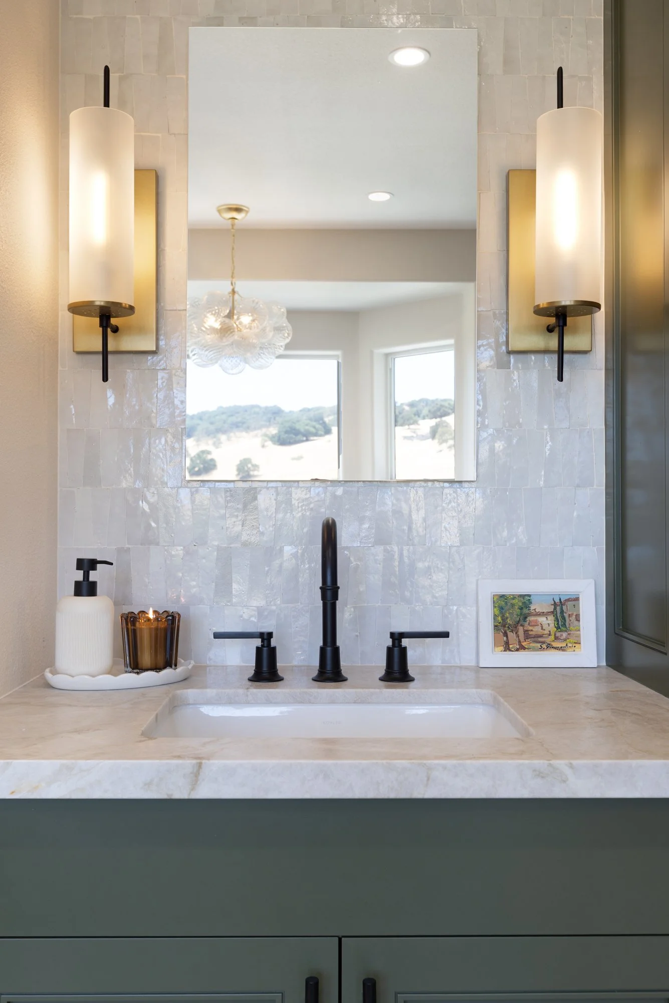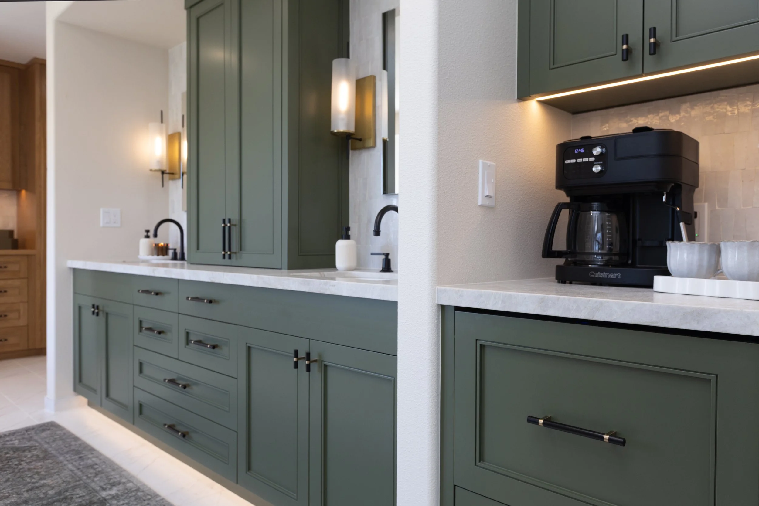This primary bath remodel is designed as a true retreat, blending luxury and function. A full-slab quartzite shower becomes the focal point, paired with a freestanding tub oriented toward sweeping hill and vineyard views. A custom vanity anchors the space with tailored storage and timeless finishes, while a private coffee station—complete with a refrigerated drawer—brings indulgence and convenience to the daily routine.
